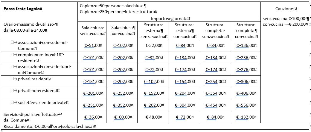 Servizi collegati Servizi collegati Cultura e tempo libero Prenotazione Parco Feste Lagolo Il Comune concede l’uso del Parco Feste Lagolo secondo quanto previsto dal regolamento comunale per la concessione e locazione di immobili Ulteriori dettagli