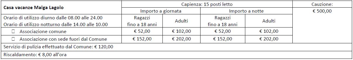Servizi collegati Servizi collegati Cultura e tempo libero Prenotazione Casa vacanze Malga Lagolo Il Comune concede l’uso della Casa vacanze Malga Lagolo secondo quanto previsto dal regolamento comunale per la concessione e locazione di immobili Ulteriori dettagli