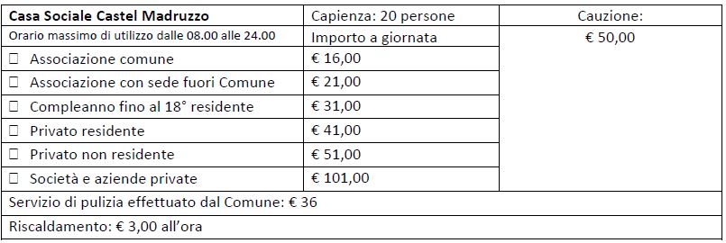 Servizi collegati Servizi collegati Cultura e tempo libero Prenotazione Casa Sociale Castel Madruzzo Il Comune concede l’uso della Casa Sociale Castel Madruzzo secondo quanto previsto dal regolamento comunale per la concessione e locazione di immobili Ulteriori dettagli