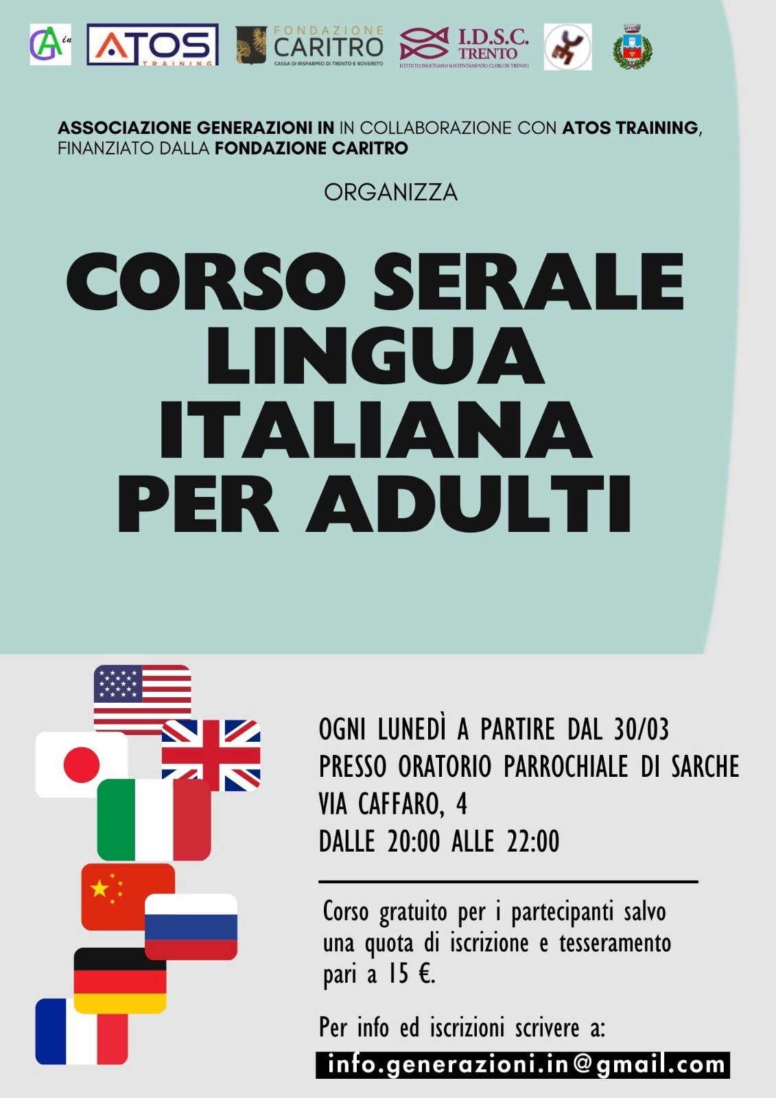 Ogni lunedì dal 30 marzo all'oratorio parrocchiale di Sarche - Via Caffaro, 4 - dalle ore 20.00 alle 22.00 è possibile frequentare un corso serale di lingua italiana per adulti.